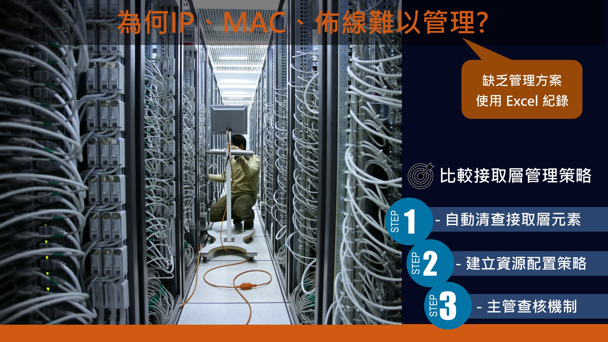 當主管進入機房, 面對一堆網路佈線而頭痛的時候, 不妨考慮導入本產品, 用以建立每日維運管理流程、建立元素配置策略。