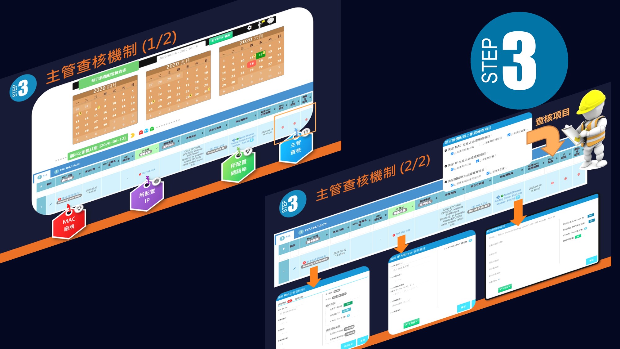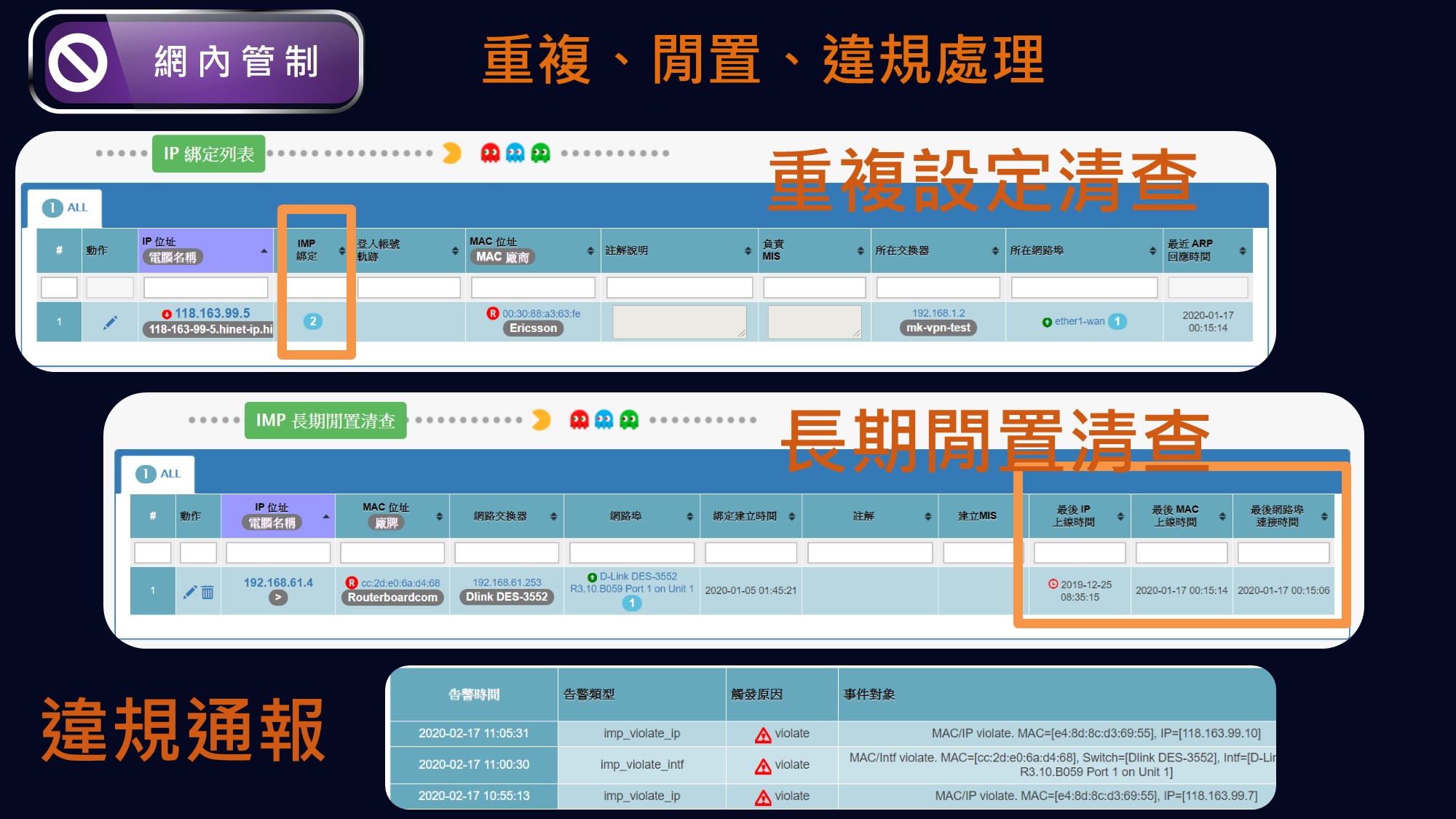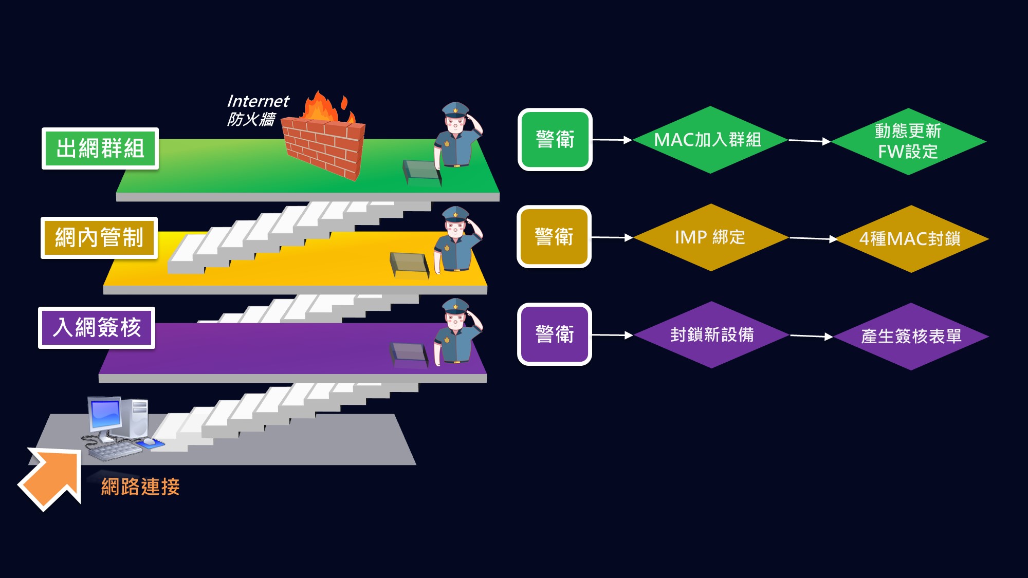 此功能負責建立新設備入網授權 (NAC)、IP/MAC/PORT 綁定等資訊安全需求, 在接取層這一道網路連接入口, 在每一個交換器之網路埠, 打造網路警衛機制, 建立設備入網控管 SOP。
