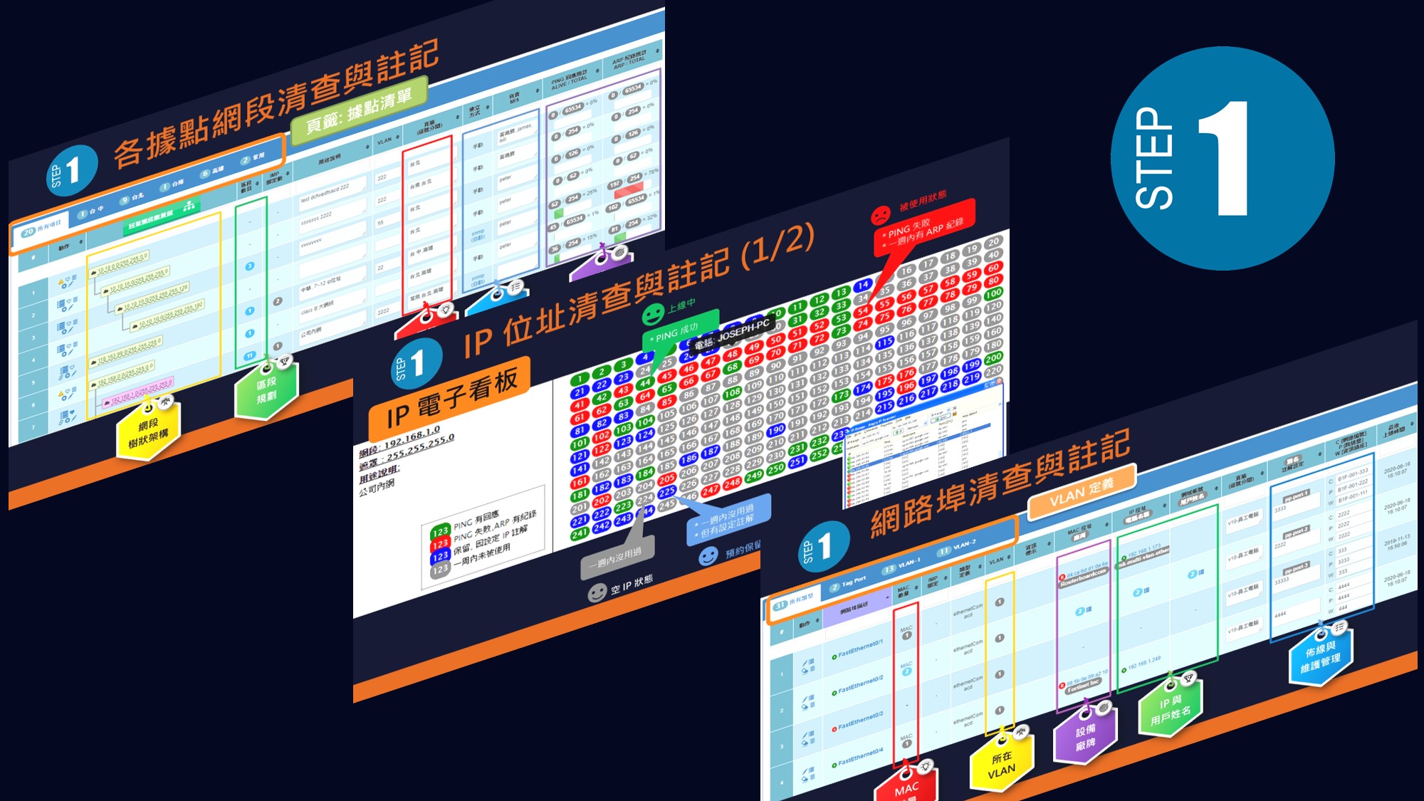 接取層元素的最大特色就是數量龐大、種類眾多,所以光靠 EXCEL 紀錄是不切實際的,因為要手動紀錄項目太多了,另外隨時都有其他人設備進入網路而異動,所以手動追蹤、同步化是相對困難的;本機制自動配對網路埠、IP位址、MAC位址、設備廠牌與各種時間數據,隨時掌握、分析、統計接取層元素狀態。