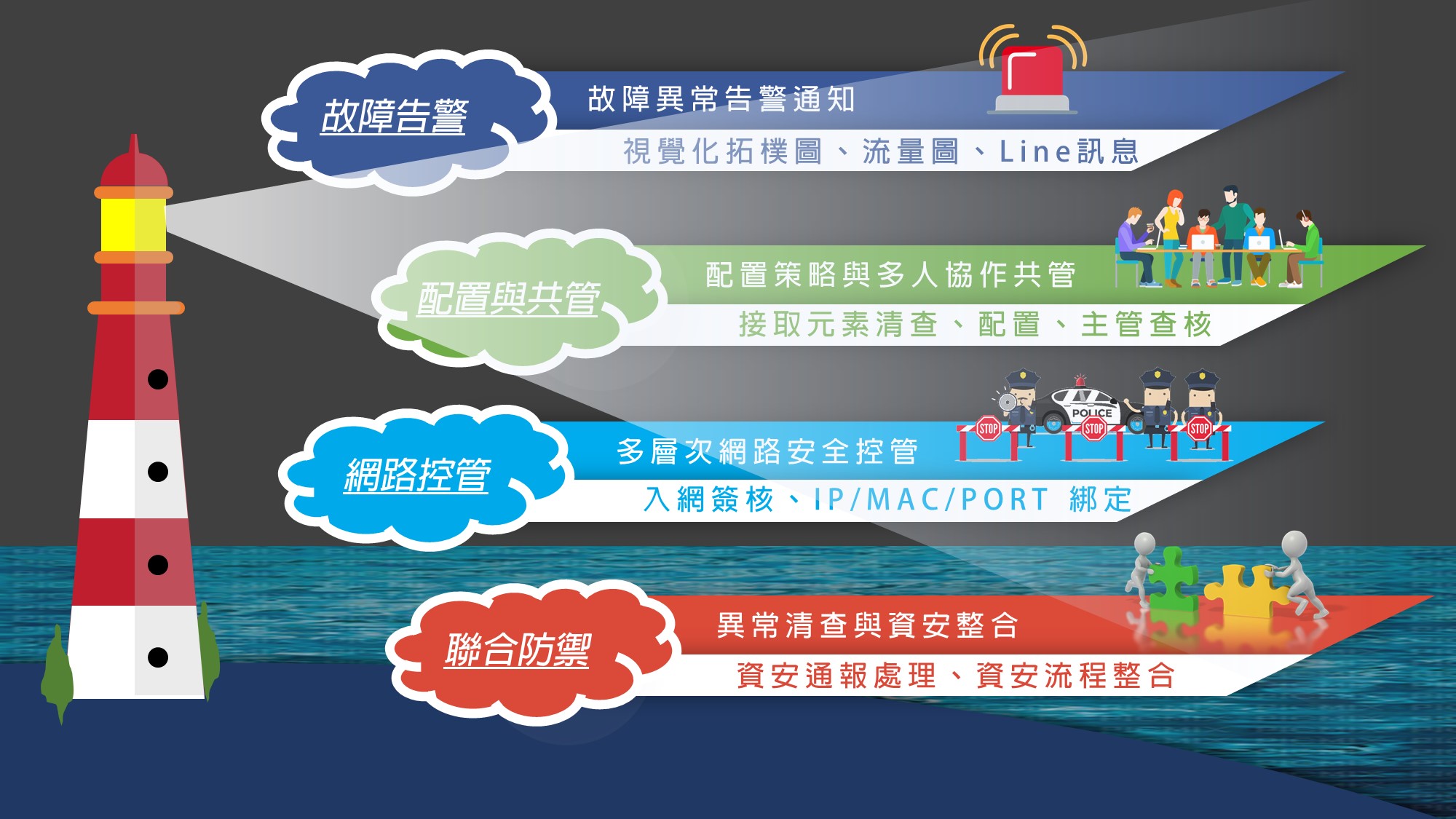 接取層配置管理器提供了三個層次的管理策略,管設備故障告警管 MIS 維運流程、以及管網路資訊安全